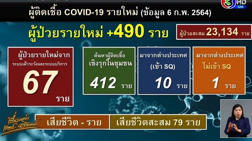 วันที่ 6 ก.พ. 2564 ศบค. แถลงยอดติดเชื้อโควิด-19 ในประเทศไทยวันนี้ พบผู้ป่วยรายใหม่ 490 ราย ผู้ป่วยสะสม 23,134 ราย แบ่งเป็นติดเชื้อในประเทศ 479 ราย (ตรวจคัดกรองเชิงรุก 412 ราย) จากต่างประเทศ 11 ราย ไม่มีผู้เสียชีวิต