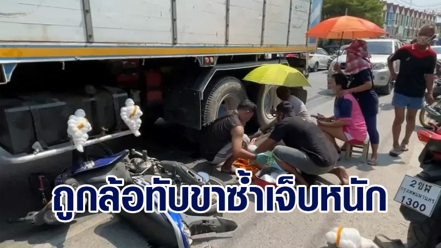 สาววัย 24 ขี่ จยย.พาน้องไปซื้อของ เกี่ยวเข้ากับตุ๊กตาติดถังน้ำมันรถบรรทุกล้ม ถูกล้อทับขาซ้ำสาหัส