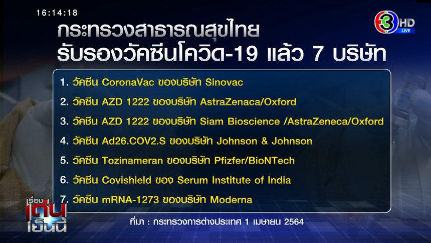 ทั้งนี้ กระทรวงการต่างประเทศ ได้เปิดเผยคืบหน้าการนำเข้าวัคซีนโควิด-19 ว่าขณะนี้มีวัคซีนที่ กระทรวงสาธารณสุขไทยรับรอง และขึ้นทะเบียนกับ WHO หรือ อย. แล้ว ทั้งสิ้น 7 บริษัท