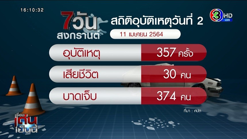 ศูนย์อำนวยการป้องกันและลดอุบัติเหตุทางถนนช่วงเทศกาลสงกรานต์ พ.ศ.2564 สรุปสถิติอุบัติเหตุทางถนนประจำวันที่ 11 เมษายน 2564 เกิดอุบัติเหตุ 357 ครั้ง ผู้เสียชีวิต 30 ราย ผู้บาดเจ็บ 374 คน