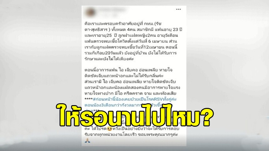 กรณีของแม่ลูกแฝด 5 เดือน พร้อมสามี ติดโควิด-19 แต่รอการช่วยเหลือ จากทางหน่วยงาน และทางโรงพยาบาลรับไปรักษานาน 20 วันแล้ว