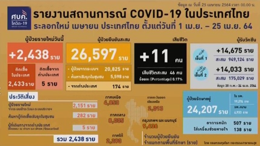 นายแพทย์ทวีศิลป์ วิษณุโยธิน โฆษกศูนย์บริหารสถานการณ์โควิด-19 หรือ ศบค. รายงานสถานการณ์การติดเชื้อ ประจำวันอาทิตย์ที่ 25 เมษายน 2564 ว่า มีผู้ติดเชื้อรายใหม่ 2,438 ราย แบ่งเป็นการติดเชื้อจากระบบเฝ้าระวังบริการ 2,151 ราย จากระบบการค้นหาเชิงรุกจำนวน 282 ราย และติดเชื้อมาจากต่างประเทศ 5 ราย รวมยอดผู้ป่วยยืนยันสะสม 55,460 ราย