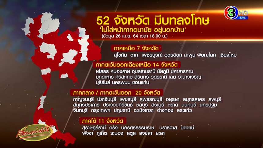 ล่าสุด ศูนย์บริหารสถานการณ์การแพร่ระบาดของโรคติดเชื้อไวรัสโคโรนา 2019 กระทรวงมหาดไทย (ศบค.มท.) เผยข้อมูล ณ เวลา 18.00 น. ของวันที่ 26 เม.ย. พบมี 52 จังหวัดที่มีมาตรการลงโทษ ประกอบด้วย