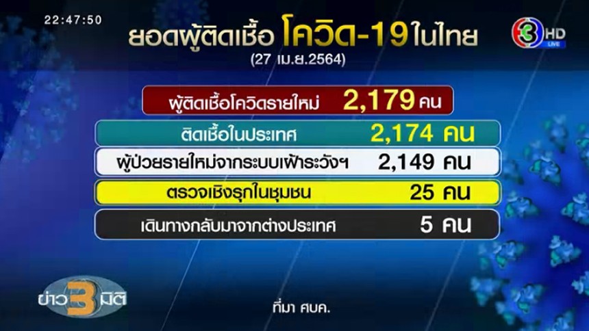 เมื่อวานนี้(27เม.ย) พบผู้ติดเชื้อรายใหม่ 2,179 คน มาจากระบบเฝ้าระวัง 2,149 คน จากการค้นหาเชิงรุก 25 คน และมาจากต่างประเทศ 5 คน ทำให้มีผู้ที่ยังต้องรักษาตัวอยู่ในโรงพยาบาล 25,973 คน โดยเป็นผู้ป่วยอาการหนัก 628 คน ต้องใส่ท่อช่วยหายใจ 169 คน ขณะที่ยอดผู้เสียชีวิตวานนี้สูงถึง 15 คน ซึ่งถือเป็นสถิติใหม่ของผู้เสียชีวิตต่อวัน ทำให้ขณะนี้ยอดผู้เสียชีวิตเฉพาะของเดือนเมษายน พุ่งสูงถึง 69 คน