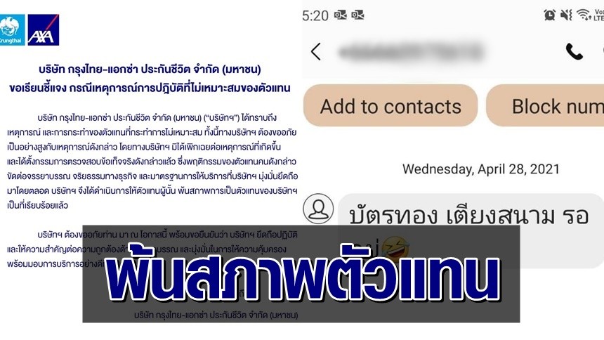 กรุงไทย-แอกซ่า ให้ตัวแทนขายประกันพ้นสภาพการเป็นตัวแทนบริษัทฯ หลังส่งข้อความเย้ยลูกค้า ชี้ชัดขัดต่อจรรยาบรรณ จริยธรรมทางธุรกิจ