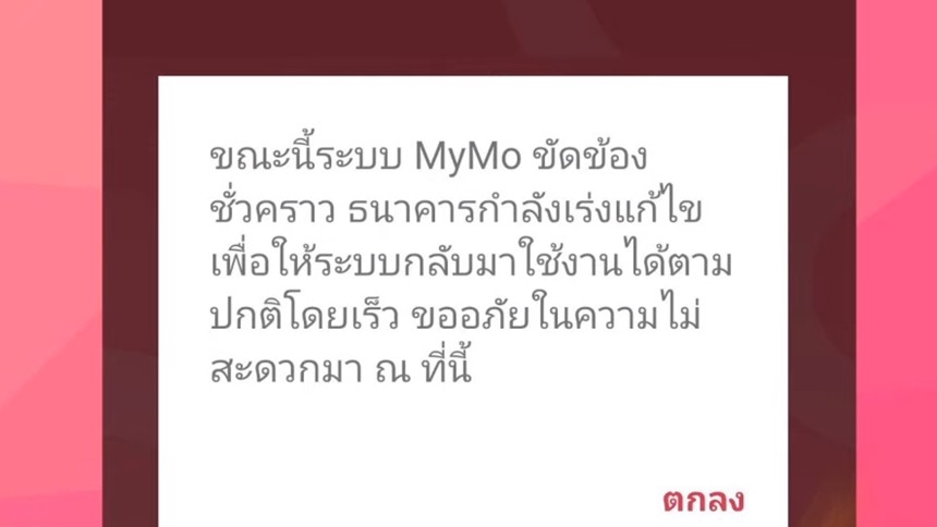 โดยมีเนื้อหาว่า รายงานข่าวจากธนาคารออมสิน แจ้งว่า จากกรณีระบบแอป Mymo ของธนาคารออมสินประสบปัญหาขัดข้อง ทำให้ลูกค้าไม่สามารถทำธุรกรรมทางการเงินได้ โดยสาเหตุอยู่ระหว่างการนำขึ้นแอปรูปแบบใหม่ แต่ประสบปัญหาทางเทคนิค ทำให้ต้องมีการจำกัดการใช้งานอันเป็นสาเหตุให้ลูกค้าจำนวนหนึ่ง ไม่สามารถเข้าใช้งานได้