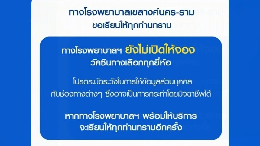 ทางโรงพยาบาลไม่ได้เปิดให้จองวัคซีนทางเลือกทุกยี่ห้อ หากทางโรงพยาบาลพร้อมให้บริการ จะเรียนให้ทุกท่านทราบอีกครั้ง โปรดระมัดวังในการให้ข้อมูลส่วนบุคคลกับช่องทางต่างๆ ซึ่งอาจเป็นการกระทำโดยมิจฉาชีพได้