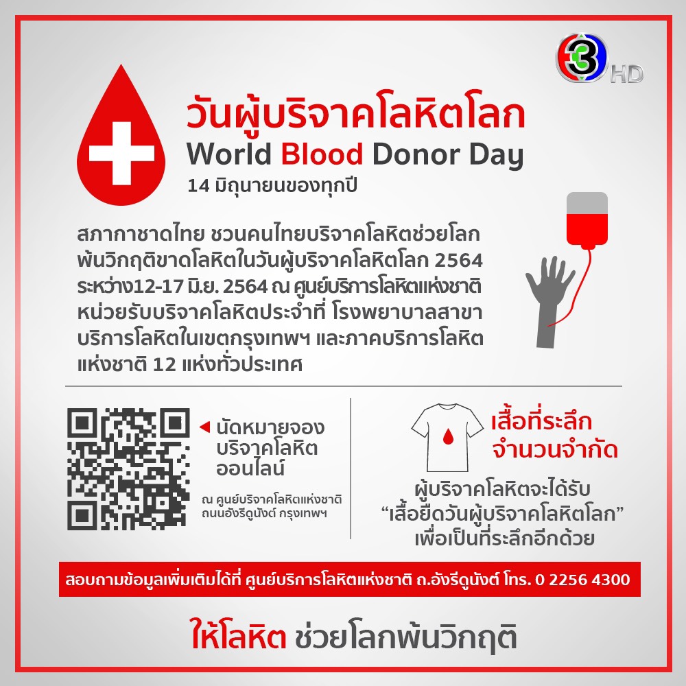 ในวันผู้บริจาคโลหิตโลก 2564 นี้ สภากาชาดไทย ชวนคนไทยบริจาคโลหิต เพื่อช่วยชีวิตผู้ป่วยและเพื่อให้ประเทศไทยมีโลหิตสำรองเพิ่มระหว่างสถานการณ์การแพร่ระบาดของ COVID-19 โดยสภากาชาดไทยจัดสัปดาห์วันผู้บริจาคโลหิตโลก ขึ้นในระหว่างวันที่ 12-17 มิถุนายน 2564 ณ ศูนย์บริการโลหิตแห่งชาติ หน่วยรับบริจาคโลหิตประจำที่ โรงพยาบาลสาขาบริการโลหิตในเขตกรุงเทพฯ และภาคบริการโลหิตแห่งชาติ 12 แห่งทั่วประเทศ โดยผู้บริจาคโลหิตจะได้รับ “เสื้อยืดวันผู้บริจาคโลหิตโลก” เพื่อเป็นที่ระลึกอีกด้วย