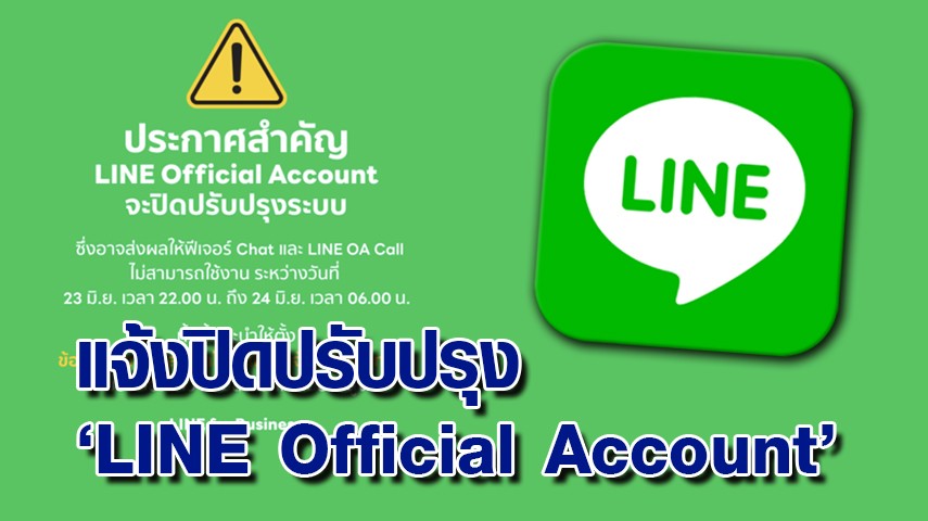 ไลน์ ประกาศแจ้งปิดปรับปรุงระบบ Line Official Account หรือ บัญชีไลน์เพื่อทำธุรกิจ ตั้งแต่เวลา 22.00 น. ของวันที่ 23 มิ.ย. 64 ถึง 06.00 น.ของวันที่ 24 มิ.ย.64 ซึ่งจะมีผลให้การใช้งาน Line Official Account ไม่สามารถใช้งานได้ชั่วคราว พร้อมแนะนำให้ตั้งข้อความตอบกลับอัตโนมัติเพื่อแจ้งให้ลูกค้าทราบ และขออภัยในความไม่สะดวก ส่วน Line ส่วนตัวยังสามารถใช้งานได้เหมือนเดิม