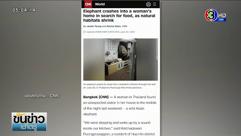 จากกรณีช้างบุกเข้าในครัวของชาวบ้านใน ต.ห้วยสัตว์ใหญ่ อ.หัวหิน จ.ประจวบคีรีขันธ์ โดยมีภาพช้างป่าโผล่หัวเข้ามาในรูกำแพงบ้านที่พังเสียหาย ถูกแชร์และพูดถึงในโลกออนไลน์ของไทยเป็นวงกว้าง ล่าสุด เว็บไซต์ซีเอ็นเอ็น รายงานถึงเรื่องดังกล่าวพร้อมกับพาดหัวข่าวว่า “ช้างพังบ้านของหญิงคนหนึ่งเพื่อหาอาหาร ผลจากที่อาศัยตามธรรมชาติน้อยลง”