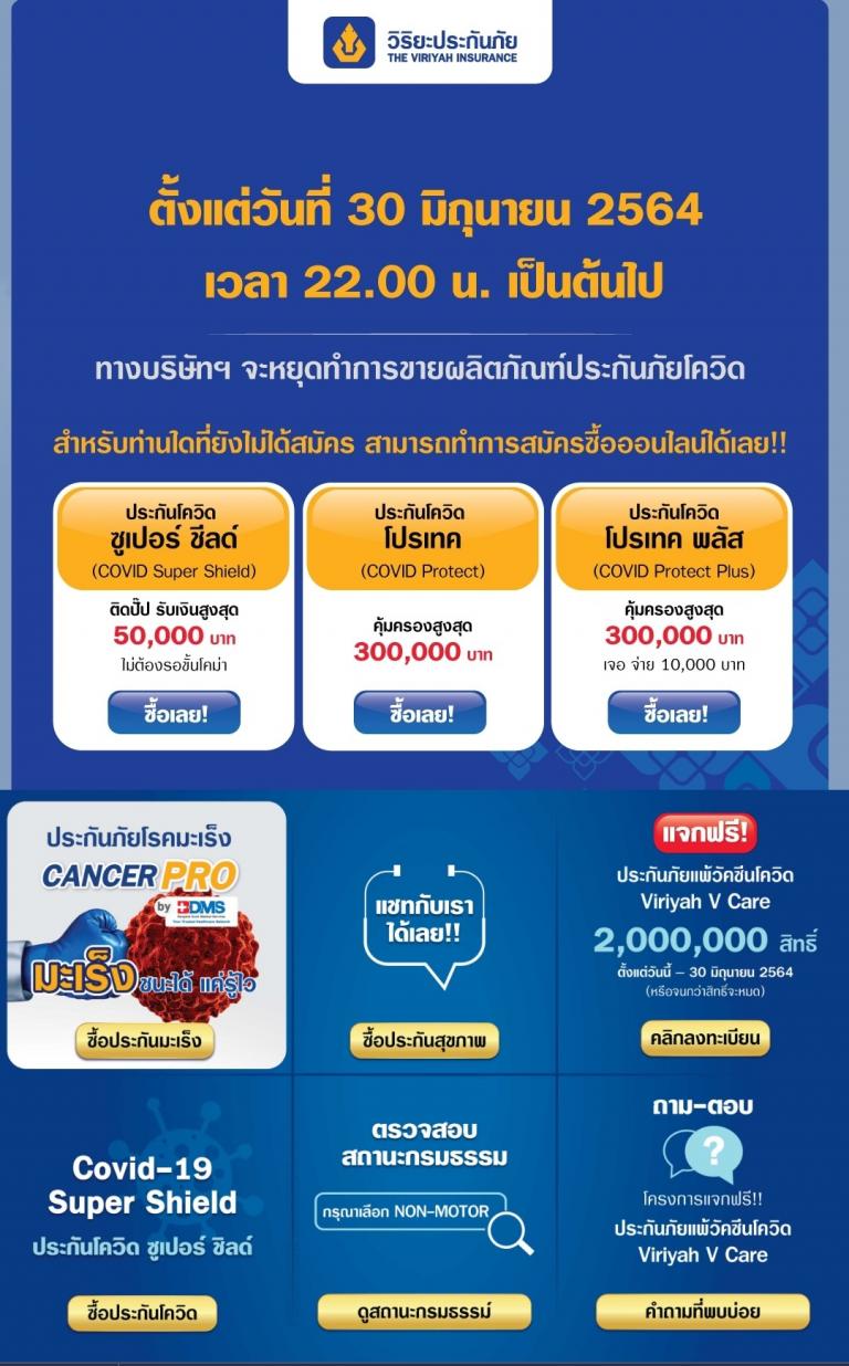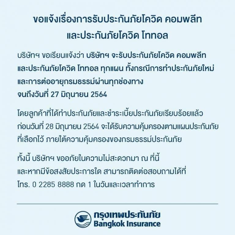 ล่าสุด พบว่าทางบริษัทประกันต่างๆ ได้เริ่มทยอยออกมาประกาศจะเลิกขายประกันโควิดแล้ว ทั้งบริษัทวิริยะประกันภัย, บริษัทกรุงเทพประกันภัย, Asia Insurance โดยล้วนแล้วแต่ปิดการขายก่อนสิ้นเดือน มิ.ย.นี้ ดังนั้นจึงคาดว่าหลังจากเดือนนี้เป็นต้นไป น่าจะหาบริษัทที่ขายประกันภัยโควิด-19 ได้ยากมาก