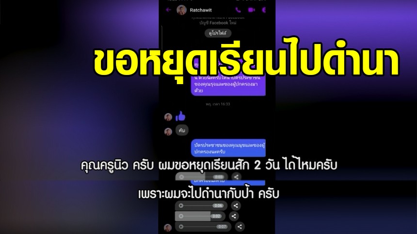 โลกออนไลน์แชร์เรื่องราวน่าเอ็นดูของเด็กน้อย ที่ส่งคลิปเสียงทางไลน์ พูดด้วยความฉะฉาน มาขออนุญาตลาหยุดกับคุณครู 2 วัน เนื่องจากต้องไปช่วยครอบครัวดำนา