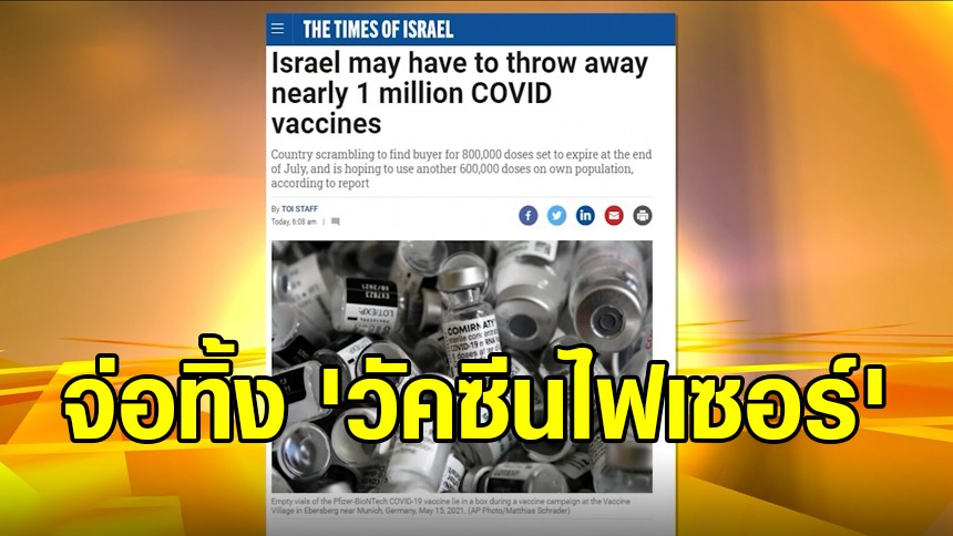 สื่อต่างประเทศรายงานว่า กระทรวงสาธารณสุข อิสราเอล เตรียมทำลายวัคซีนโควิด-19 ยี่ห้อไฟเซอร์ ที่กำลังจะหมดอายุจำนวนอย่างน้อย 800,000 โดสทิ้ง หากไม่สามารถหาผู้ที่จะมาซื้อวัคซีนเหล่านี้ได้ภายในอีก 2 สัปดาห์ข้างหน้า