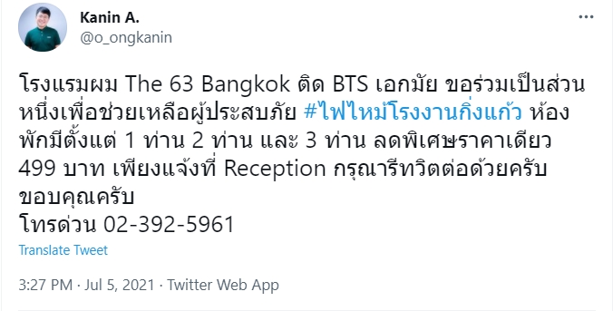 "โรงแรมผม The 63 Bangkok ติด BTS เอกมัย ขอร่วมเป็นส่วนหนึ่งเพื่อช่วยเหลือผู้ประสบภัย #ไฟไหม้โรงงานกิ่งแก้ว ห้องพักมีตั้งแต่ 1 ท่าน 2 ท่าน และ 3 ท่าน ลดพิเศษราคาเดียว 499 บาท เพียงแจ้งที่ Reception กรุณารีทวิตต่อด้วยครับ ขอบคุณครับ โทรด่วน 02-392-5961 และ 094-493-3518"