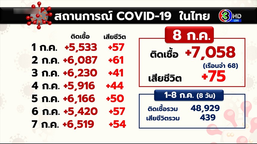 ทุบสถิติทั้งติดและตาย! โควิดวันนี้ 8 ก.ค.64 ป่วยเพิ่ม 7,058 ราย ดับพุ่ง 75 ราย
