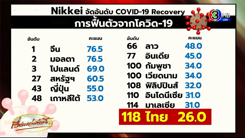 ด้านนิกเคอิ จัดอันดับประเทศฟื้นตัวจากโควิด โดยประเทศไทยอยู่อันดับที่ 118 ระดับ 26.0 คะแนน ขณะที่อันดับ 1 ได้แก่ จีน 76.5 คะแนน ส่วนชาติอาเซียนที่อันดับดีที่สุดคือ สปป.ลาว อันดับที่ 66 อยู่ที่ 48 คะแนน