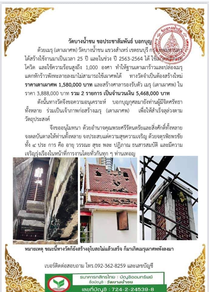 วัดบางน้ำชน ขอประชาสัมพันธ์ บอกบุญ ด้วยเมรุ (เตาเผาศพ) วัดบางน้ำชน แขวงสำเหร่ เขตธนบุรี กรุงเทพมหานคร ได้สร้างใช้งานมาเป็นเวลา 25 ปี และในช่วง ปี 2563-2564 ได้ ใช้เผาศพติดโรคโควิด และใช้ความร้อนสูงถึง 1,000 องศา ทำให้ฐานเตาเผาร้าวและปล่องเมรุ แตกหักร้าวพังทะลายลงมาไม่สามารถใช้เผาศพได้ ทางวัดจำเป็นต้องสร้างใหม่ ราคาเตาเผาศพ 1,580,000 บาท และสร้างศาลารองรับตัวเมรุ (เตาเผาศพ) ในราคา 3,888,000 บาท รวม 2 รายการ เป็นจำนวนเงิน 5,468,000 บาท
