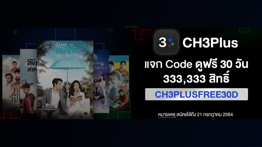จากสถานการณ์โควิด-19 ที่ถาโถมและยังคงน่าเป็นห่วง ยอดผู้ติดเชื้อโควิด-19 ทะลุหมื่นรายติดต่อกันมาหลายวัน ส่งผลให้ทุกคนต้องกลับมากักตัวและทำงานจากที่บ้านแทน CH3Plus จึงขอเป็นส่วนหนึ่งในการช่วยพยุงจิตใจของคุณไม่ให้เบื่อ และอุดอู้ไปมากกว่านี้ ด้วยการแจกโค้ดให้แฟน ๆ ได้ดู CH3Plus Premium ฟรี 30 วัน จำนวน 333,333 สิทธิ์ โดยแฟนๆ จะได้ดู Exclusive Content และ ดูละครย้อนหลัง แบบไม่มีโฆษณาคั่น
