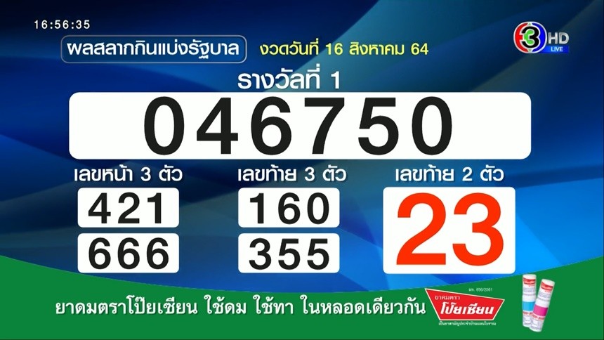 ผลสลากกินแบ่งรัฐบาล งวดวันที่ 16 สิงหาคม 2564
