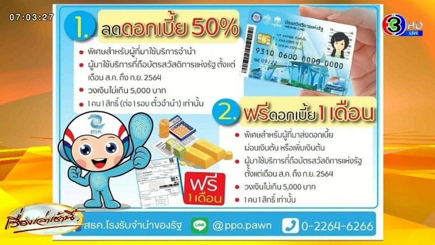 โรงจำนำรัฐ ออกโปรลดดอกเบี้ย 50% ให้ผู้จำนำใหม่ ถือบัตรสวัสดิการแห่งรัฐ ส่งดอกเบี้ยได้ที่เซเว่น
