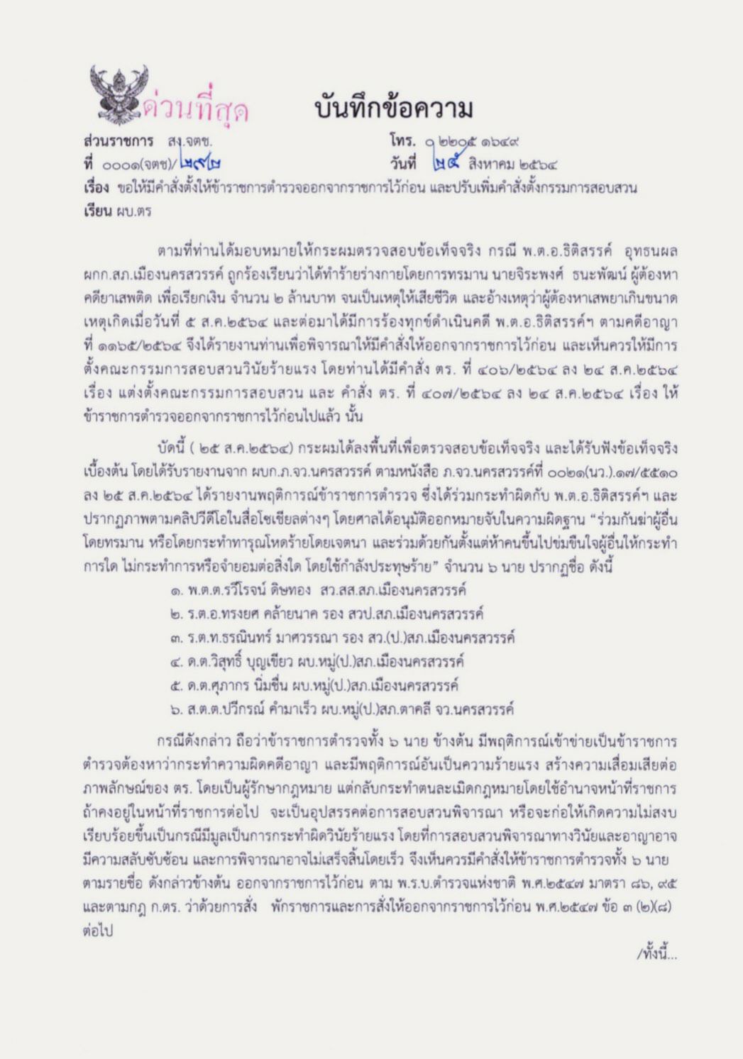 วันนี้ (25 สิงหาคม 2564) ที่สำนักงานตำรวจแห่งชาติ (ตร.) พล.ต.อ.วิสนุ ปราสาททองโอสถ จเรตำรวจแห่งชาติ มีบันทึกข้อความด่วนที่สุด ที่ 0001 (จตช) / 292 ลงวันที่ 25 สิงหาคม 2564 เสนอ ผบ.ตร. ให้ เรื่องขอให้มีคำสั่งตั้งให้ข้าราชการตำรวจออกจากราชการไว้ก่อนประกอบด้วย พ.ต.ต.รวีโรจน์ ดิษทอง สว.สส.สภ.เมืองนครสวรรค์, ร.ต.อ.ทรงยศ คล้ายนาค รอง สวป.สภ.เมืองนครสวรรค์, ร.ต.ท.ธรณินทร์ มาศวรรณา รอง สว.(ป.) สภ.เมืองนครสวรรค์, ด.ต.วิสุทธิ์ บุญเขียว ผบ.หมู่ (ป) .สภ.เมืองนครสวรรค์, ด.ต.ศุภากร นิ่มชื่น ผบ.หมู่ (ป) สภ.เมืองนครสวรรค์ และ ส.ต.ต.ปวีกรณ์ คำมาเร็ว ผบ.หมู่ (ป.)สภ.ตาคลี จว.นครสวรรค์ จำนวน 6 นาย