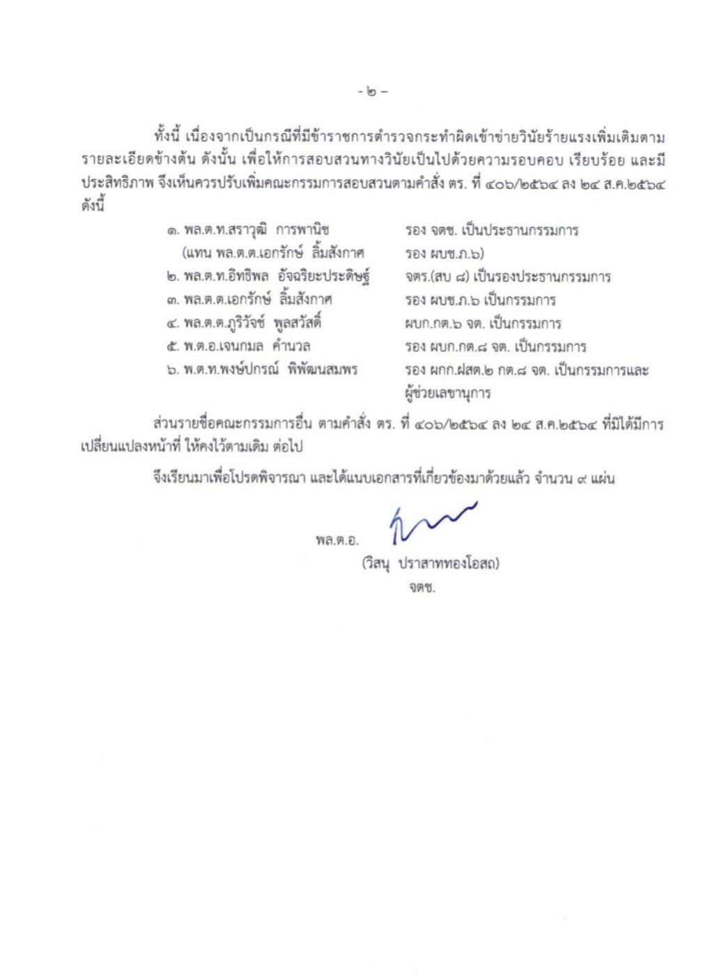 ทั้งนี้ เนื่องจากเป็นกรณีที่มีข้าราชการตำรวจกระทำผิดเข้าข่ายวินัยร้ายแรงเพิ่มเติมและเพื่อให้การสอบสวนทางวินัยเป็นไปด้วยความรอบคอบ เรียบร้อย และมีประสิทธิภาพ จึงเห็นควรปรับเพิ่มคำสั่งตั้งคณะกรรมการสอบสวนตามคำสั่งตร. ที่ 406/2564 ลง 24 ส.ค.2564 ให้ พล.ต.ท.สราวุฒิ การพานิช รอง จตช. เป็นประธานกรรมการ (แทน พล.ต.ต.เอกรัษ์ ลิ้มสังกาศ รอง ผบช.ภ.6), พล.ต.ท.อิทธิพล อัจฉริยะประดิษฐ์ จตร. (สบ.8) เป็นรองประธานกรรมการ,พล.ต.ต.เอกรักษ์ ลิ้มสังกาศ รอง ผบช.ภ.6 เป็นกรรมการ,พล.ต.ต.ภูริวัจซ์ พูลสวัสดิ์ ผบก.กต.6 จต. เป็นกรรมการ,พ.ต.อ.เจนกมล คำนวล รอง ผบก.กต.8 จต. เป็นกรรมการ,พ.ต.ท.พงษ์ปกรณ์ พิพัฒนสมพร รอง ผกก.ฝสต.2 กต.8 จต. เป็นกรรมการและผู้ช่วยเลขานุการ ส่วนรายชื่อคณะกรรมการอื่น ตามคำสั่ง ตร.ที่มิได้มีการเปลี่ยนแปลงหน้าที่ให้คงไว้ตามเดิมต่อไป