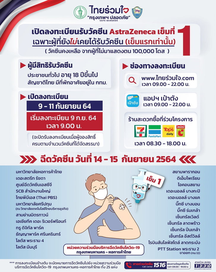 วันนี้ (6 ก.ย. 64) เฟซบุ๊กเพจ ไทยร่วมใจ กรุงเทพฯ ปลอดภัย Safe Bangkok ได้โพสต์ข้อความ ระบุว่า เปิดลงทะเบียนรับวัคซีน AstraZeneca เข็มที่ 1 เฉพาะผู้ที่ยังไม่เคยได้รับวัคซีน (วัคซีนคงเหลือ จากผู้ที่ไม่มาแสดงตน 100,000 โดส) เริ่มลงทะเบียน 9 กันยายน 2564 เวลา 09.00 น. และเข้ารับการฉีดวัคซีนวันที่ 14 - 15 กันยายน 2564
