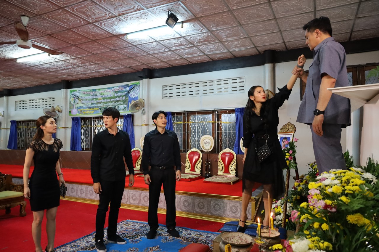 ฉากนี้ถ่ายทำกันที่วัดชมภูเวก เป็นฉากงานศพที่รวมนักแสดงไว้เกือบครบ ฉากค่อนข้างตื่นเต้น และหลอนหน่อยๆเมื่อพี่ต้น จักรกฤษณ์ ที่ตอนแรกดูใจเย็น ไม่มีพิษไม่มีภัย นั่งเฝ้า นั่งจีบเจ๊แพท ณปภา ไปวันๆ ลุกขึ้นมาอาละวาด ผลักโลงหล่นลงมา ไม่เชื่อว่าตัวเองตาย ทำเอาแขกในงานวิ่งหนีกันกระเจิดกระเจิง รวมทั้งแก๊งกลัวผีด้วย แต่สุดท้ายก็ต้องกลับมาช่วยแพท ที่โดนผีพี่ต้นดึงตัวเองไว้ จะพาไปลงในโลงด้วยกันอีก มีพี่อั๋น จับแขนแพท ยื้อกันไปมากับพี่ต้นจนวุ่นวาย ก่อนที่เจมส์ กับ มิว และ อั๋น จะพยายามเกลี้ยกล่อมว่าปล่อยแพทเถอะ เพราะผีกับคนมันอยู่ด้วยกันไม่ได้ กล่อมกันอยู่นานทีเดียวกว่าจะสำเร็จ เป็นฉากที่ทั้งดูดราม่า ทั้งดูฮา ดาราเยอะด้วย แสดงกันไป คุยกันไปอย่างสนุกสนาน