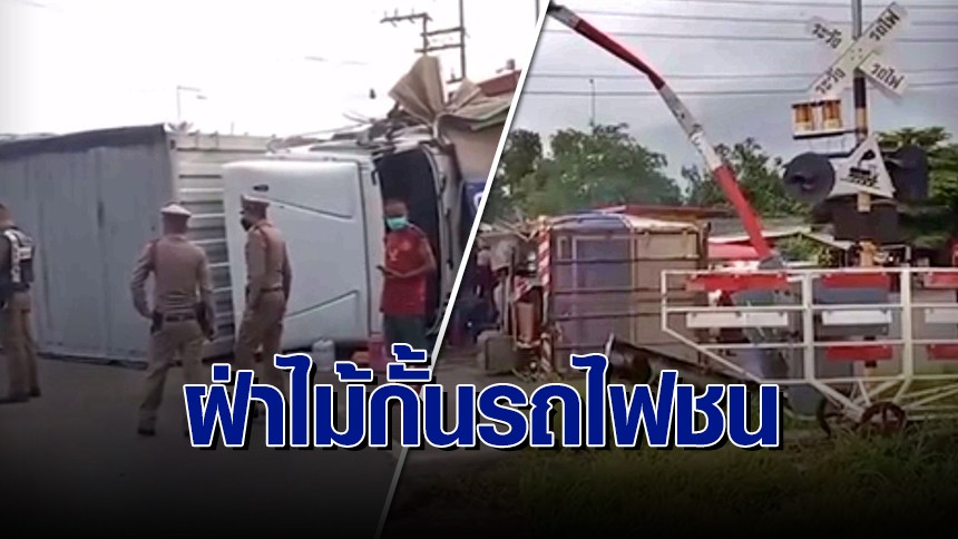 สิบล้อเห็นไม้กั้นลงมานานนึกว่าเสีย หักหัวหลบหวังข้ามราง รถไฟชนสนั่นขาอัดติดคอนโซล