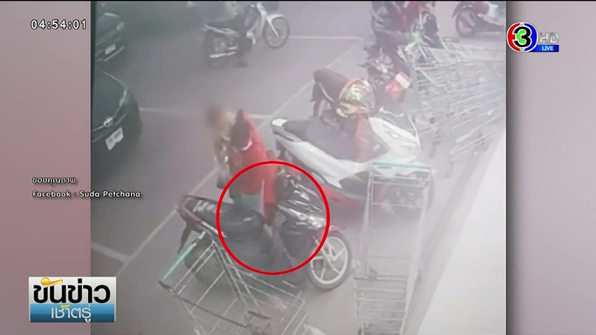 คุณน้ำ ชาวจังหวัดกระบี่ โพสต์ภาพจากกล้องวงจรปิดหน้าร้านสะดวกซื้อแห่งหนึ่ง ในพื้นที่อำเภอเขาพนม จับภาพหญิงคนหนึ่ง สวมเสื้อสีแดง กางเกงสีเทา ทำทีเหมือนพาลูกวัย 3-4 ขวบ มาเดินเล่น และยังมีเด็กโตอีก 2 คน เดินอยู่บริเวณที่จอดรถหน้าร้านสะดวกซื้อ คาดว่าเป็นแม่ลูกกัน จังหวะที่ปล่อยให้ลูกวิ่งเล่น แม่รายนี้ ก็เดินตระเวนสอดส่องทรัพย์สินของชาวบ้าน ที่แขวนทิ้งไว้กับรถจักรยานยนต์ที่จอดไว้หน้าร้านสะดวกซื้อ ซึ่งมาแจ๊กพอตที่รถของคุณน้ำ ซึ่งไปจอดไว้หน้าร้านสะดวกซื้อ โดยวางขนมห่อใหญ่ไว้ที่รถ ส่วนตัวคุณน้ำเดินเข้าร้านสะดวกซื้อไปซื้อของเพิ่มเติม แม่รายนี้อุ้มลูกมาหยิบถุงขนมของคุณน้ำไปอย่างหน้าตาเฉย