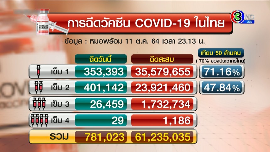 ฉีดได้เพิ่ม 781,023 โดส ฉีดสะสม 61,235,035 โดส