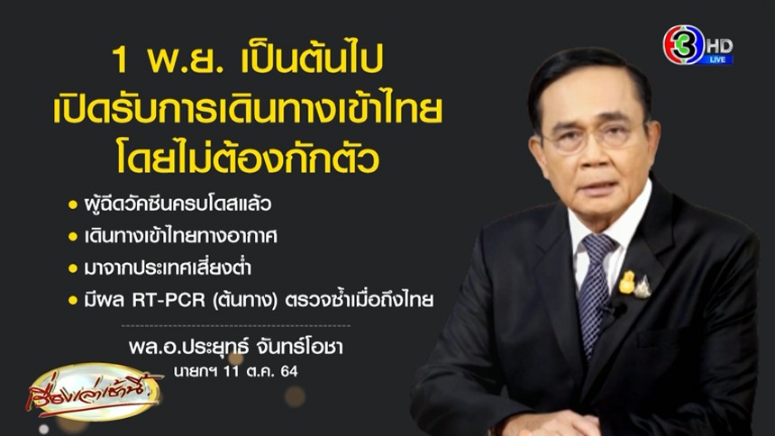 เพราะฉะนั้น วันนี้ตนได้สั่งการให้ ศูนย์บริหารสถานการณ์โควิด-19 หรือ ศบค. และ กระทรวงสาธารณสุข ร่วมพิจารณา โดยตั้งแต่วันที่ 1 พฤศจิกายน เป็นต้นไป ประเทศไทยจะเริ่มเปิดรับการเดินทางเข้าประเทศไทย โดยไม่ต้องกักตัว