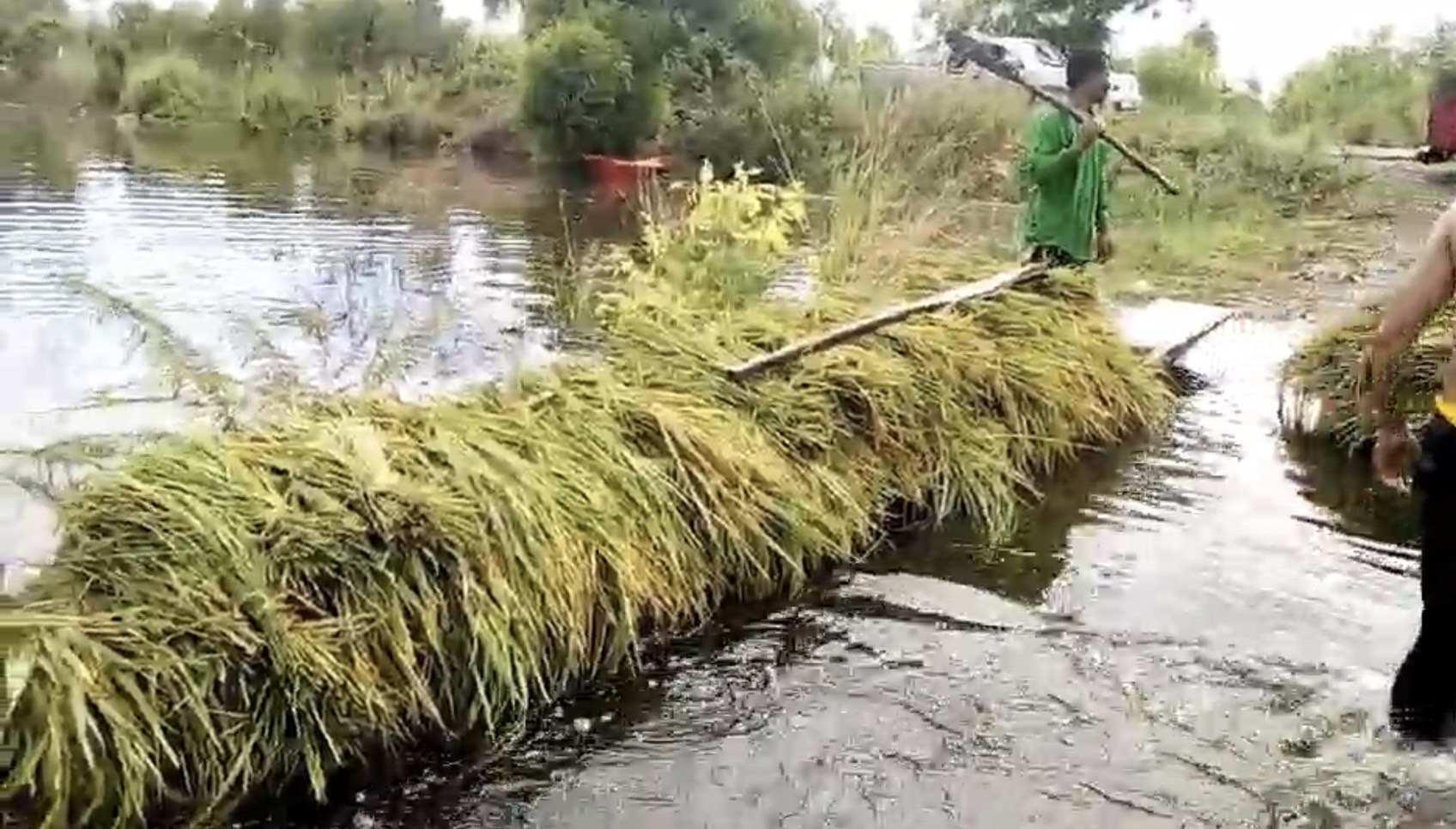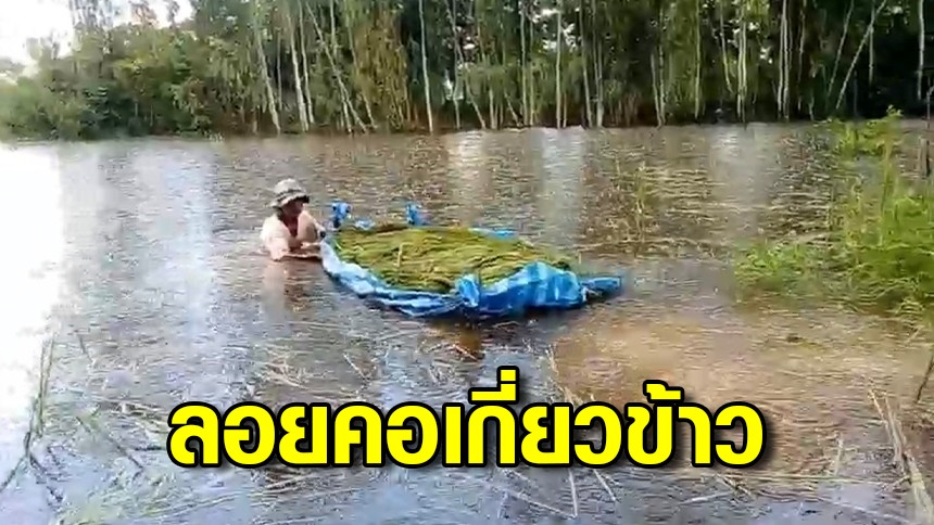 น้ำมูลหลากท่วมนาข้าว ชาวนาเร่งช่วยกันเกี่ยวข้าวก่อนถูกน้ำท่วมเสียหาย