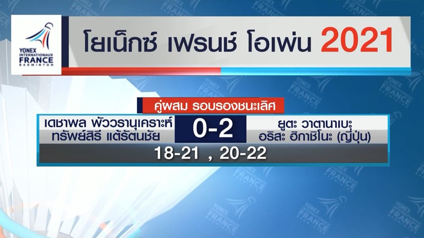 การแข่งขันแบดมินตัน เฟรนช์ โอเพ่น ที่กรุงปารีส มีนักกีฬาไทยผ่านเข้าถึงรอบรองชนะเลิศ ประเภทเดียวคือคู่ผสม ล่าสุดแข่งขันจบแล้ว โดย “บาส”เดชาพล พัววรานุเคราะห์ และ “ปอป้อ” ทรัพยสิรี แต้รัตนชัย คู่มือวางอันดับหนึ่งของรายการ แพ้ ยูตะ วาตานาเบะ และอริสะ ฮิกาชิโนะ คู่มือวางอันดับ 3 ของรายการจากญี่ปุ่น 18-21 และ 20-22