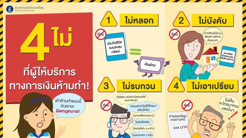 โดยหากผู้ให้บริการทางการเงิน เช่น ธนาคาร, Non-Bank ที่อยู่ภายใต้การกำกับดูแลของแบงก์ชาติให้บริการอย่างไม่เหมาะสม เข้าข่ายการฝ่าฝืน '4 ไม่' แบบนี้