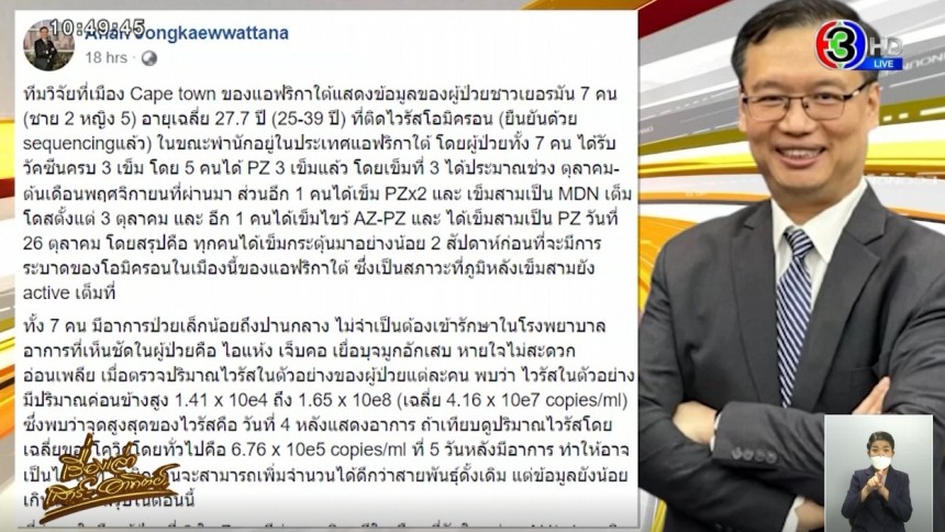ทีมวิจัยที่เมือง Cape town ของแอฟริกาใต้แสดงข้อมูลของผู้ป่วยชาวเยอรมัน 7 คน (ชาย 2 หญิง 5) อายุเฉลี่ย 27.7 ปี (25-39 ปี) ที่ติดไวรัสโอมิครอน (ยืนยันด้วย sequencing แล้ว) ในขณะพำนักอยู่ในประเทศแอฟริกาใต้ โดยผู้ป่วยทั้ง 7 คน ได้รับวัคซีนครบ 3 เข็ม โดย 5 คนได้ PZ 3 เข็มแล้ว โดยเข็มที่ 3 ได้ประมาณช่วง ตุลาคม-ต้นเดือนพฤศจิกายนที่ผ่านมา ส่วนอีก 1 คนได้เข็ม PZx2 และ เข็มสามเป็น MDN เต็มโดส ตั้งแต่ 3 ตุลาคม และ อีก 1 คนได้เข็มไขว้ AZ-PZ และ ได้เข็มสามเป็น PZ วันที่ 26 ตุลาคม