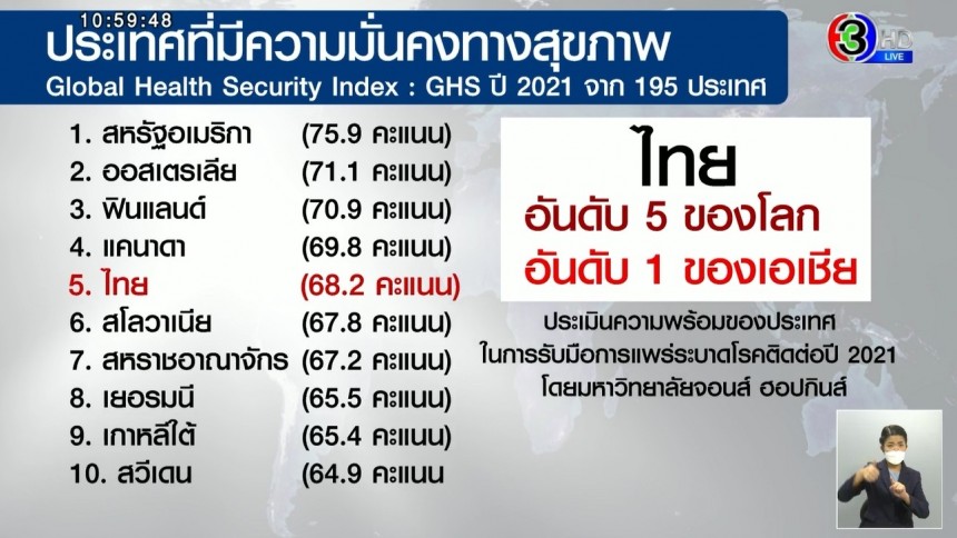 ไทยติดอันดับ 5 ของโลก ประเทศที่มีความมั่นคงทางสุขภาพ Global Health Security Index : GHS ปี 2021 จาก 195 ประเทศ