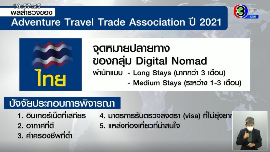 โดยจากผลการสำรวจของ Adventure Travel Trade Association ปี 2021 พบว่า ไทยเป็นหนึ่งในจุดหมายปลายทางยอดนิยมของกลุ่ม Digital Nomad ในลักษณะของการพำนักแบบ Long Stays (มากกว่า 3 เดือนขึ้นไป) และ Medium Stays (ระหว่าง 1-3 เดือน) โดยมีปัจจัยประกอบการพิจารณา ได้แก่ 1. อินเทอร์เน็ตที่เสถียร 2. อากาศที่ดี 3. ค่าครองชีพที่ต่ำ 4. มาตรการรับตรวจลงตรา (visa) ที่ไม่ยุ่งยาก และ 5. แหล่งท่องเที่ยวที่น่าสนใจ