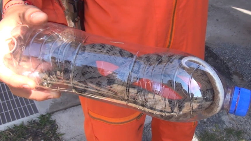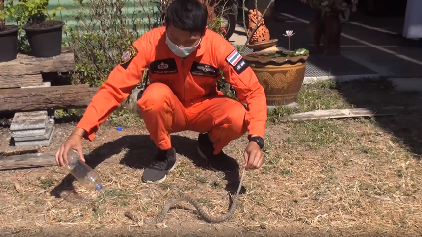 บ้านที่เกิดเหตุพบ นางธารีรัตน์ มัฆนาโส หรือป้าต้อย อายุ 61 ปี เจ้าของบ้านนำเจ้าหน้าที่ ปภ. ตรวจสอบและจับงูที่หลบซ่อนตัวอยู่ในแปลงต้นไม้มงคลข้างบันไดหน้าบ้าน เมื่อพบตัวงูที่เจ้าของบ้านแจ้งไปว่าเป็นงูสิง แต่กลับกลายเป็นงูเพา หรืองูปี่แก้ว ยาวประมาณ 1 เมตร ซึ่งเป็นงูมีพิษอ่อน เจ้าหน้าที่ไม่รอช้าปรี่ตรงใช้มือเปล่าจับที่หางงู ส่วนมืออีกข้างจับขวดน้ำพลาสติกขนาด 1 ลิตร พยายามบังคับงูให้เลื้อยเข้าไปในขวดพลาสติก แต่งูไม่ยอมเข้า และพยายามต่อสู้ ซึ่งเจ้าของบ้านเชื่อว่างูคงมาให้โชค เพราะใกล้วันหวยออก และไม่ยอมให้ถูกจับไปปล่อยที่อื่น เหมือนกับอยากจะอยู่บ้านหลังนี้ ผ่านไปราว 5 นาที งูเพาตัวนี้จึงยอมเข้าไปขดอยู่ในขวด