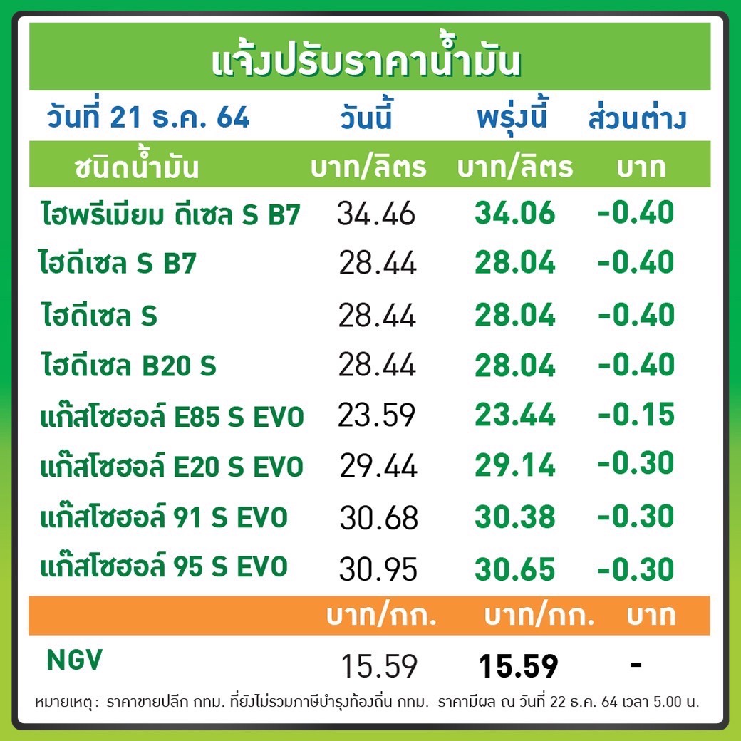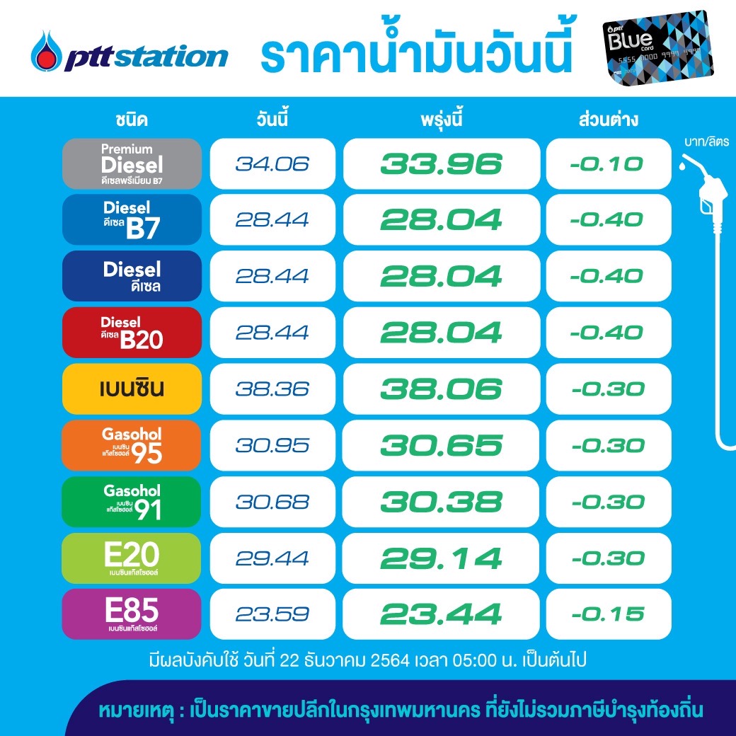 บริษัท ปตท. น้ำมันและการค้าปลีก จำกัด (มหาชน) หรือ OR และ บริษัท บางจาก คอร์ปอเรชั่น จำกัด (มหาชน) หรือ BCP ปรับลดราคาขายปลีกน้ำมันกลุ่มเบนซินและแก๊สโซฮอล์ทุกชนิดลง 0.30 บาทต่อลิตร เว้น E85 ลดลง 0.15 บาทต่อลิตร ส่วนกลุ่มดีเซลทุกชนิด ลดลง 0.40 บาทต่อลิตร ส่วนดีเซลพรีเมี่ยม B7 ลดลง 0.10 บาทต่อลิตร มีผล 22 ธ.ค.64 เวลา 05.00 น. เป็นต้นไป