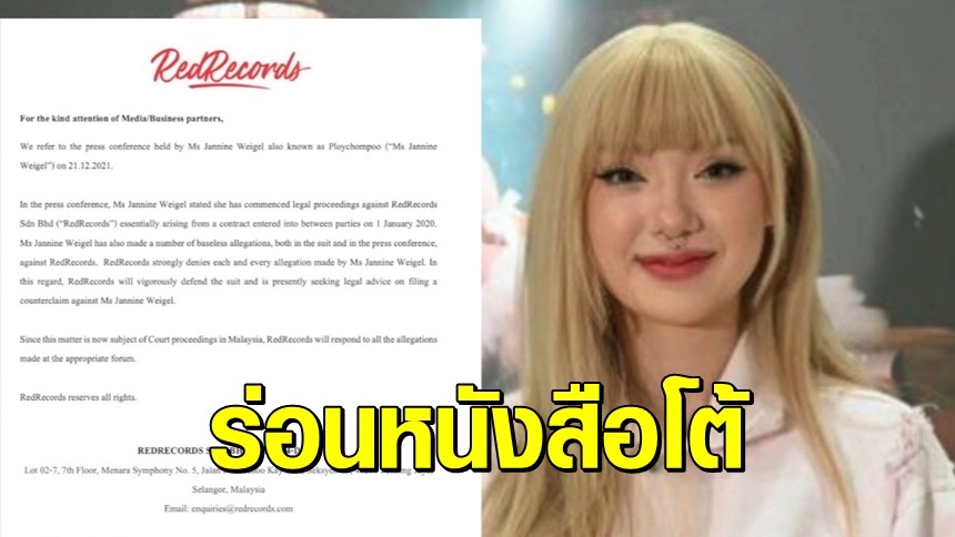 “บริษัท ฯ ขออ้างอิงถึงการแถลงข่าวที่จัดขึ้นโดย คุณพลอยชมพู หรือนางสาวญานนีน ภารวี ไวเกล หรือ Jannine Weigel เมื่อวันที่ 21 ธันวาคม 2564 ในการแถลงข่าวดังกล่าว คุณพลอยชมพู หรือนางสาวญานนีน ภารวี ไวเกล หรือ Jannine Weigel ระบุว่า เธอได้เริ่มดำเนินคดีต่อค่ายเพลง หรือบริษัท เรด เรคคอร์ดส จำกัด (“REDRECORDS”) ที่เกิดจากสัญญาที่มีการทำขึ้นระหว่างคู่สัญญาเมื่อวันที่ 1 มกราคม 2563