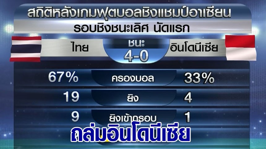 และถึงนาทีที่ 67 สุภโชค สารชาติ ยิงนอกกรอบเขตโทษให้ไทย นำห่าง 3-0 และในช่วงท้ายเกม ไทย มาได้ประตูปิดท้ายจาก บดินทร์ ผาลา จบเกม ไทย ชนะ อินโดนีเซีย 4-0 กุมความได้เปรียบเอาไว้มาก ก่อนแข่งขันรอบชิง นัดที่ 2 วันเสาร์นี้ สถิติ หลังจบเกม ไทย เหนือกว่า อินโด ทั้งการครองบอล ไทย ได้ยิงแต่ไม่เข้ากรอบ ..... และยิงเข้ากรอบ ส่วนใบเหลือง