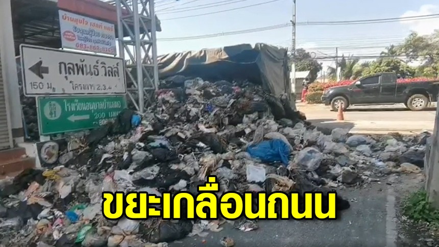รถบรรทุกขยะ 18 ล้อ เสียหลักพลิกตะแคงข้างถนน ขยะกว่า 30 ตัน เกลื่อนถนน