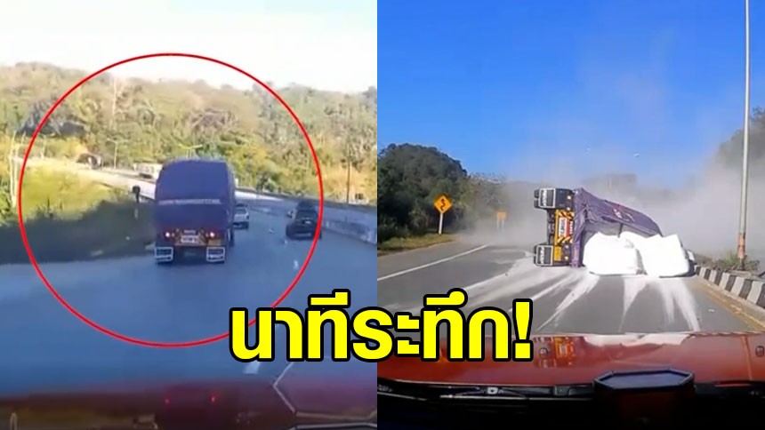 มีรถบรรทุกขับแซงซ้ายด้วยความเร็วขึ้นไปทั้งที่เป็นทางโค้ง จู่ๆ รถ 18 ล้อ เกิดเอียงจากด้านหลังที่เป็นพ่วงบรรทุกสินค้า จนพาให้รถทั้งค้นล้มตะแคงลากไปกับท้องถนน ยังดีที่สติดีที่ไม่ได้บ้าแซงไปรถบรรทุกดังกล่าว จึงนำมาเตือนและให้สติผู้คนที่ใช้เส้นทาง