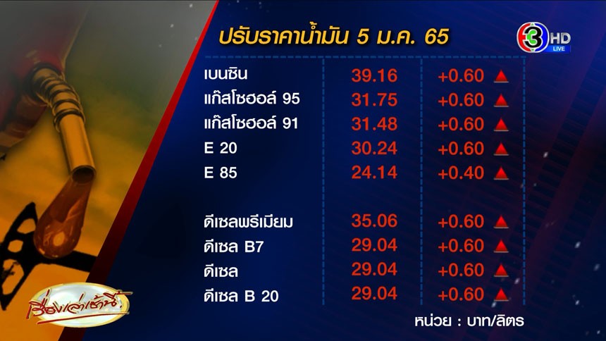 น้ำมันในกลุ่มเบนซิน เพิ่มขึ้น 0.60 บาท ส่วน E85 เพิ่มขึ้น 0.40 บาท