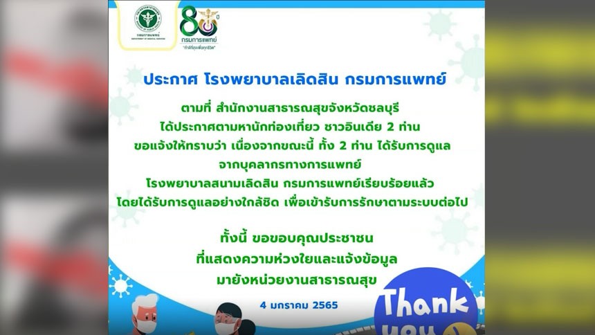 วันที่ 4 มกราคม 2565 พล.ต.ต.อภิชาติ สุริบุญญา รองผู้บัญชาการตำรวจท่องเที่ยว ในฐานะโฆษกกองบัญชาการตำรวจท่องเที่ยว ได้ชี้แจงกรณีนักท่องเที่ยวอินเดีย 2 คนที่พบผลตรวจเชื้อโควิดแบบ PCR เป็นบวกแล้วหายตัวไป โดยเจ้าหน้าที่สาธารณสุขจังหวัดชลบุรี ได้เขียนโพสต์ผ่านโซเชียลมีเดียให้สังคมช่วยตามหาตัวเมื่อช่วงบ่ายวันเดียวกันที่ผ่านมาว่า หลังจากที่ตำรวจท่องเที่ยวได้รับแจ้ง ก็ได้ประสานข้อมูลกับเจ้าหน้าที่สาธารณสุขทันที พร้อมทั้งได้ประสานไปยังสถานทูตอินเดียประจำประเทศไทยด้วย