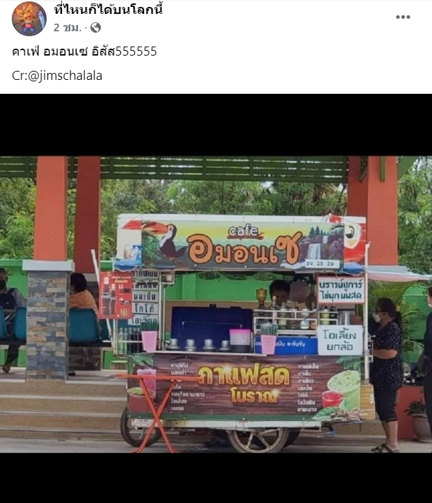ยุคนี้การขายของต้องสร้างจุดเด่นที่จดจำง่ายสำหรับผู้ที่พบเห็น เพจที่ไหนก็ได้บนโลกใบนี้ ได้แชร์รูปภาพรถเคลื่อนที่ร้านขายน้ำหวานชงแห่งหนึ่ง ที่มาพร้อมการตั้งชื่อร้านที่เรียกเสียงหัวเราะให้กับผู้ที่พบเห็น เพราะหากผวนชื่อร้านกลับดีๆจะพบว่าชื่อร้านน้ำนี้มีความคล้องจองกับร้านคาเฟ่ดังร้านหนึ่ง หลังจาก ที่รูปนี้ถูกเผยแพร่ออกไปในโลกโซเชียล มีคนเข้ามาแสดงความคิดเห็นพร้อมกดแชร์ออกไปเป็นจำนวนมาก