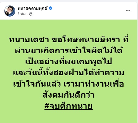 เช่นเดียวกับ “ทนายตั้ม” ที่โพสต์ข้อความผ่านเฟซบุ๊กของตัวเองว่า วันนี้ผมได้ปรับความเข้าใจกับอาจารย์เดชาแล้วนะครับ ได้พูดคุยเปิดอกกันอย่างจริงจัง ทนายเดชายอมรับอย่างจริงใจ ว่าเขาถูกปลุกปั่น ได้รับข้อมูลอันเป็นเท็จมากมายเกี่ยวกับตัวผม และผิดเองที่ไม่รับฟังข้อมูลจากปากผมเองและเชื่ออีกฝ่ายหนึ่ง ส่วนตัวผมเองก็ผิดเช่นกัน ในฐานะทนายรุ่นน้อง ก็ต้องกราบขอโทษอาจารย์เดชาเช่นกันที่หลายครั้งก็ใช้อารมณ์ในการตอบโต้ แทนที่จะใช้เหตุผลในการอธิบายแต่แรก พวกเราเลยตัดสินใจว่าต่างคนต่างให้อภัยและถอนฟ้องในทุกคดีกันหมด และเลือกใช้เวลาหลังจากนี้ในการช่วยเหลือสังคมแทน