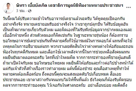 ผู้สื่อข่าวรายงานว่า ทนายเดชา กิตติวิทยานันท์ ประธานเครือข่ายทนายคลายทุกข์ ได้โพสต์ข้อความผ่านเฟซบุ๊ก ระบุ ได้เคลียร์ใจกับ ทนายตั้ม-ษิทรา เบี้ยบังเกิด เลขาธิการมูลนิธิทีมงานทนายประชาชน เป็นที่เรียบร้อยแล้ว หลังจากทราบกันดีว่าทั้ง 2 คน มักจะมีมุมมองทางความคิดด้านทนายความที่แตกต่างกัน อีกทั้งยังพูดถึงและวิพากษ์วิจารณ์ต่อกันผ่านทางโซเชียลมีเดียอยู่ตลอด