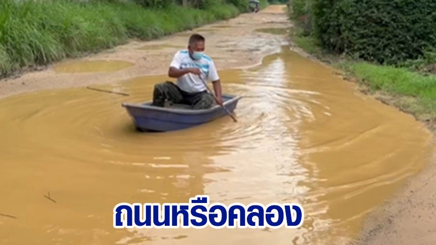 ชาวบ้านพายเรือกลางถนน ประชด ถนนพังแรมปี ไร้หน่วยงานเหลียวแล